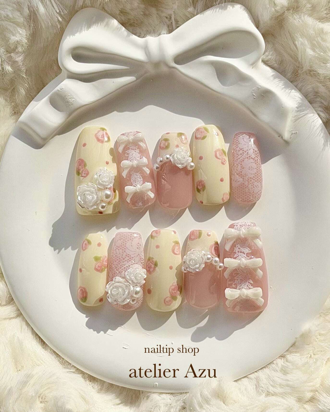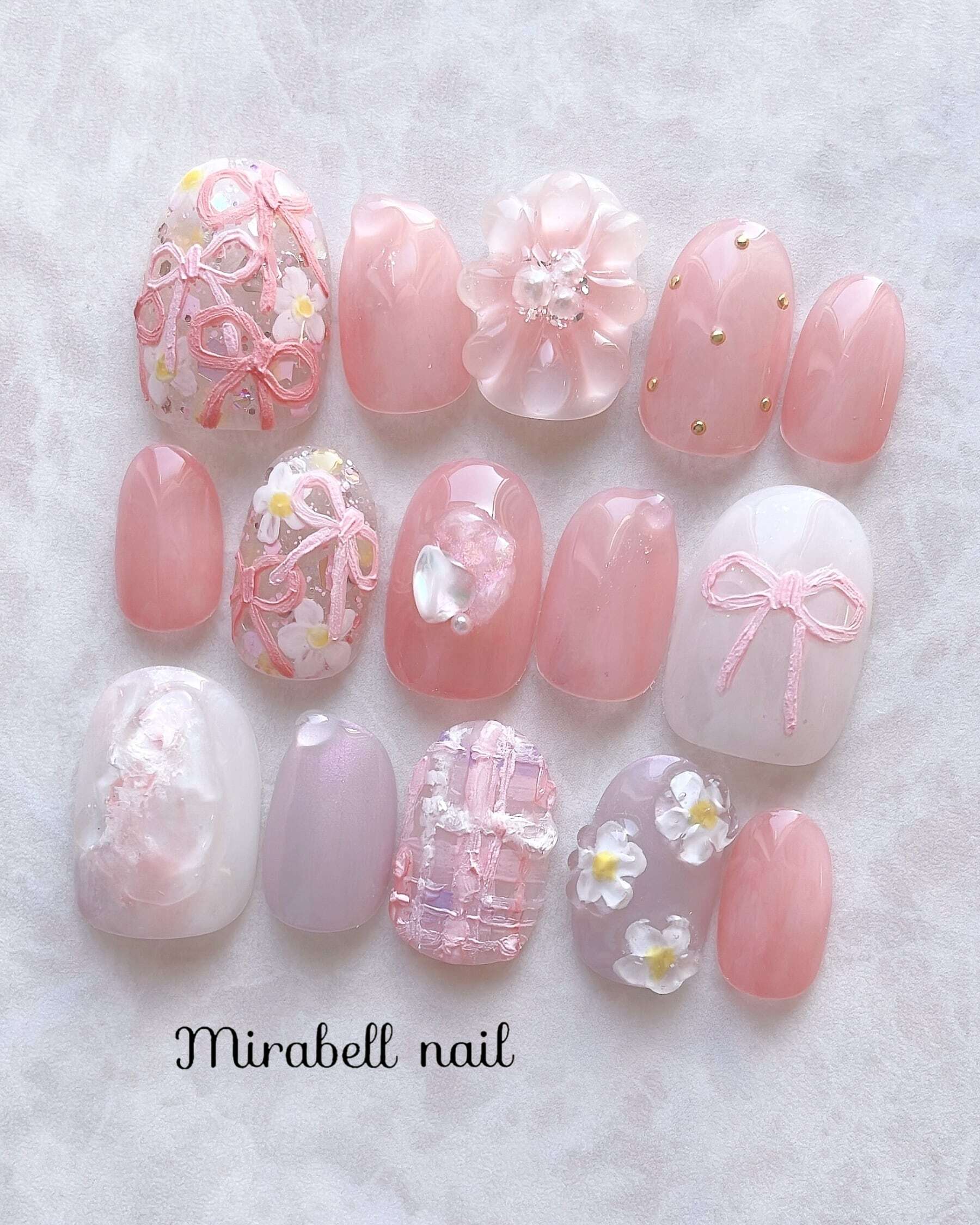 【完成品 即日発送】ピンク リボン ぷっくり 質感 ニュアンス 15枚 ネイルチップ セット #ncs019