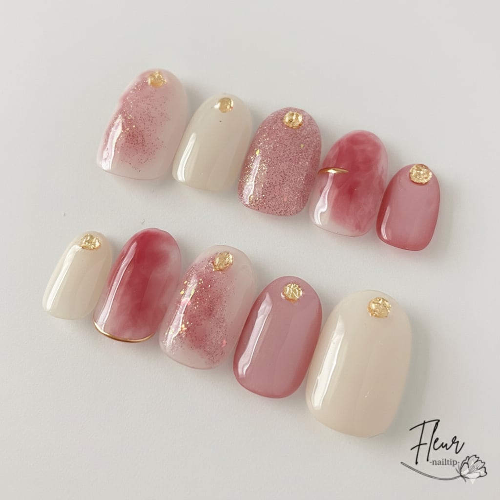 淡いピンクベージュや微細ラメを組み合わせ、