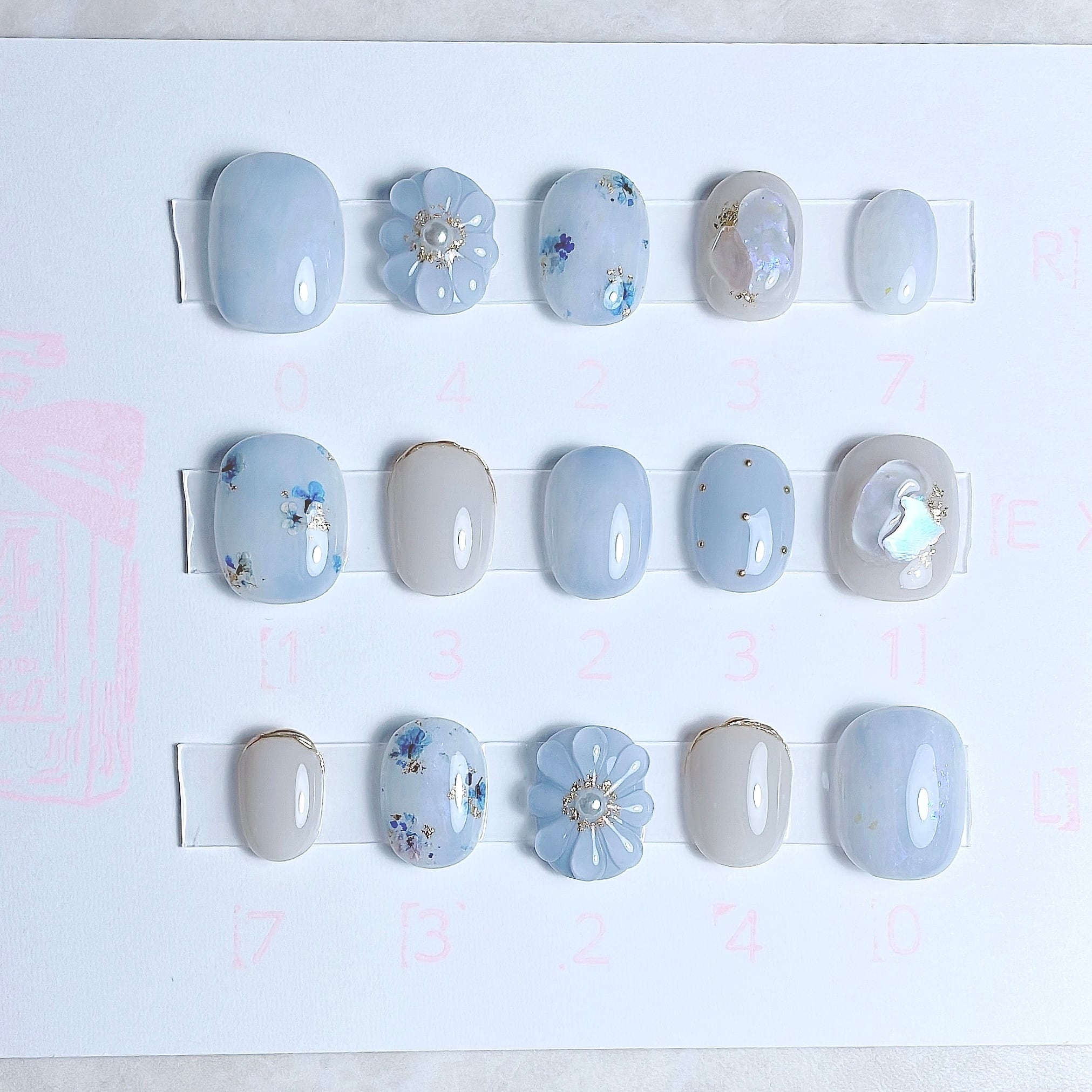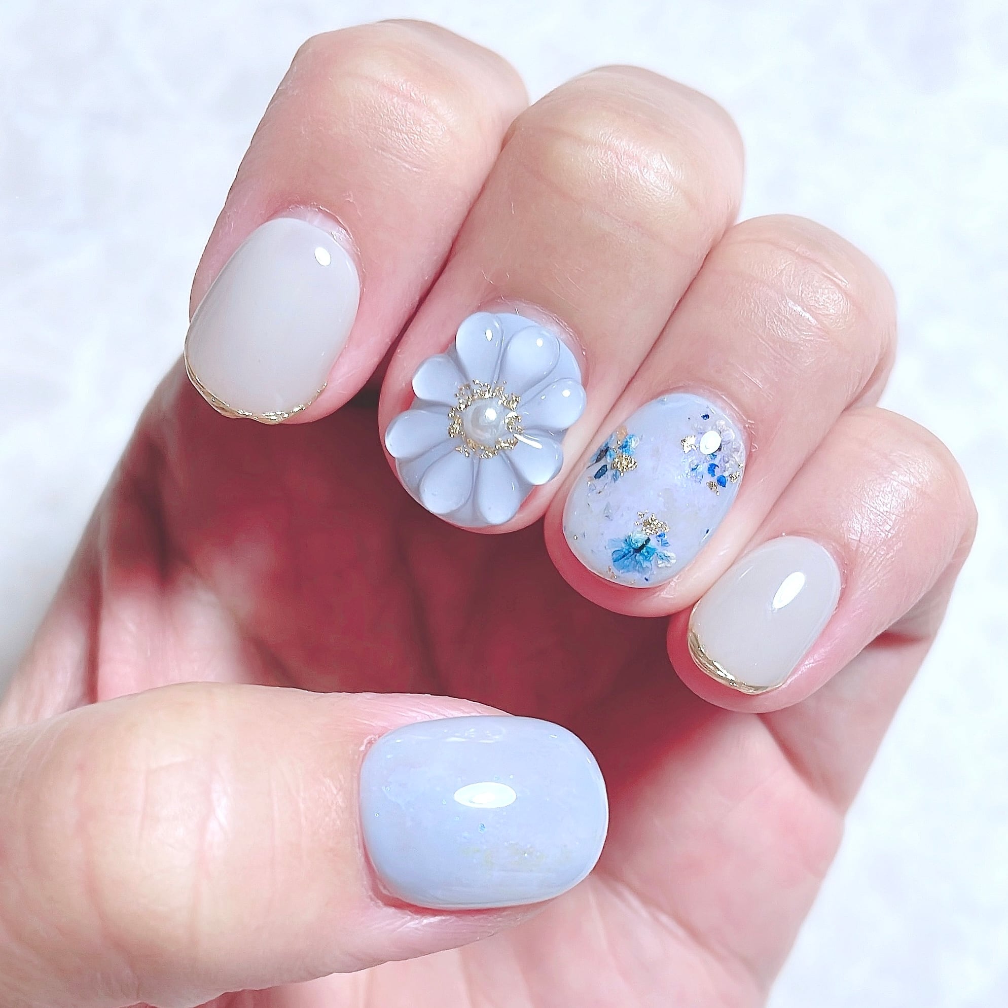 【完成品 即日発送】押し花 くすみブルー オーロラ ぷっくり フラワー 15枚 ネイルチップ セット #ncs019