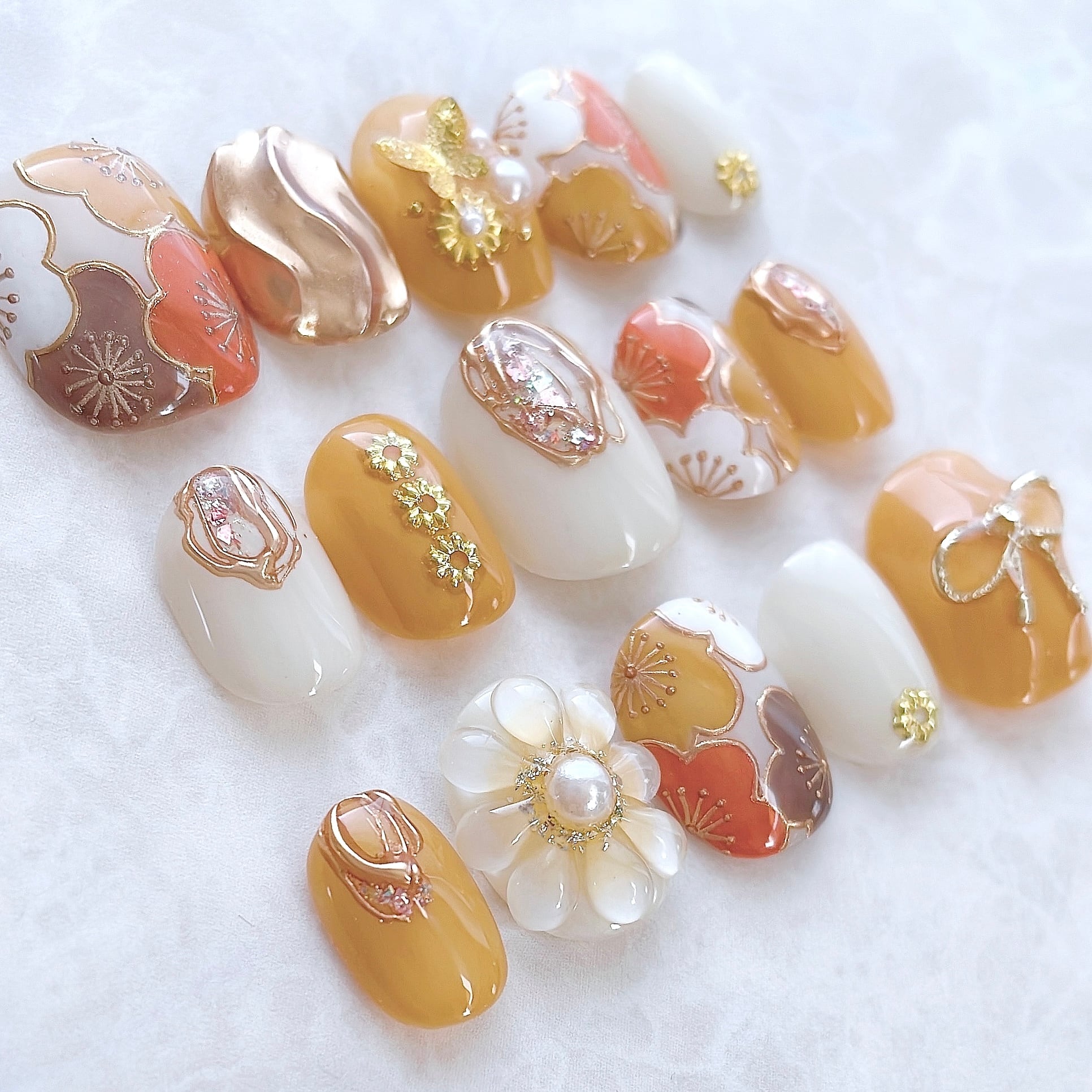 和柄 オレンジ 梅 ぷっくり フラワー 花 リボン 10枚 15枚 ネイルチップ オーダー セット #ncs019