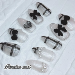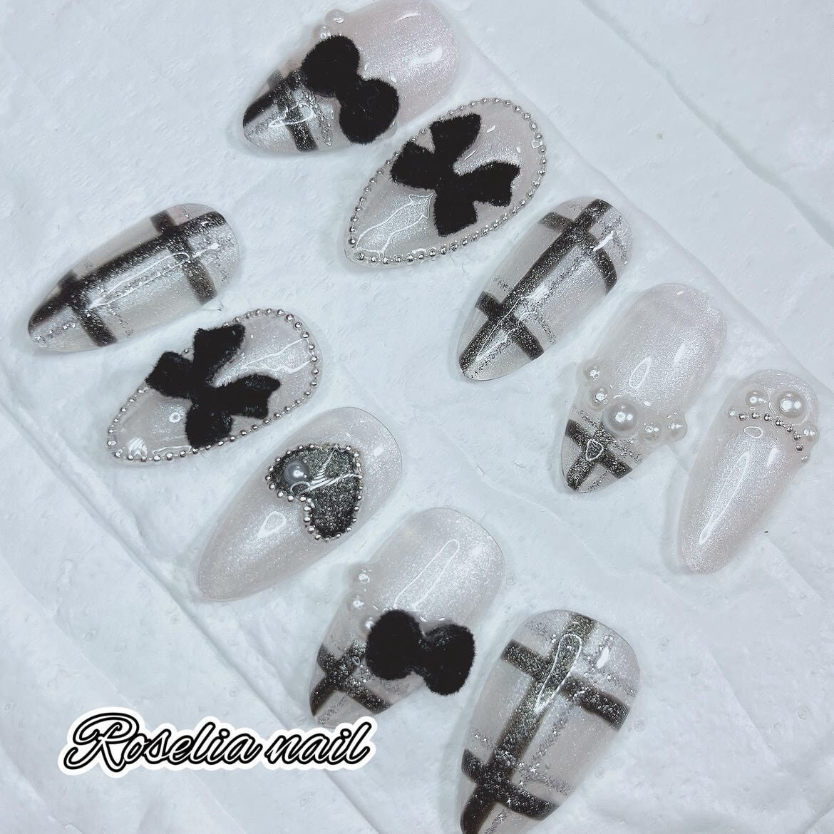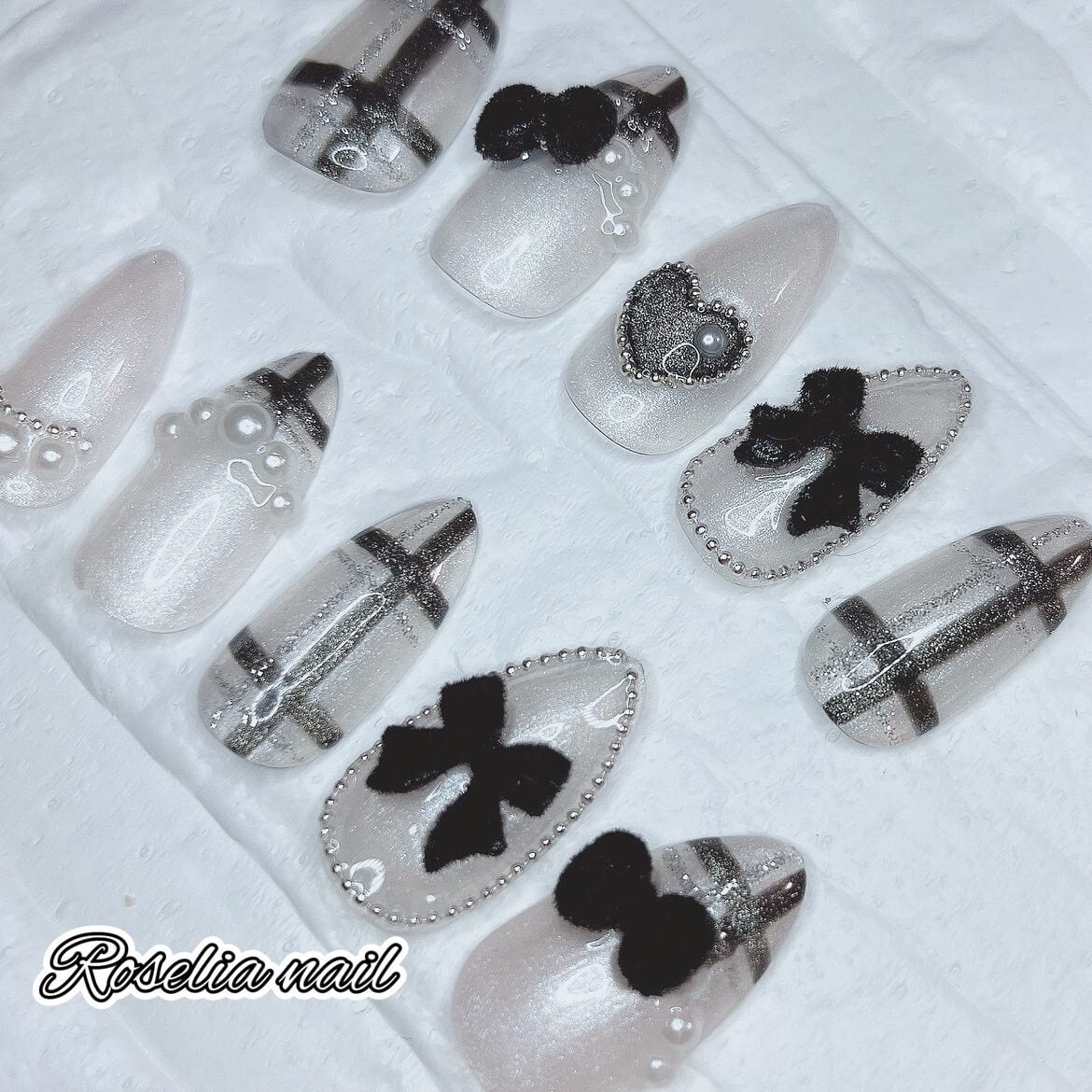 もふもふ・冬・モノクロ・ブラック・黒色・チェック柄・リボン・ガーリー・可愛い系・デート・ネイルチップ#ncs026
