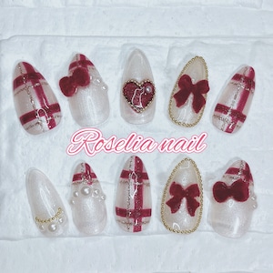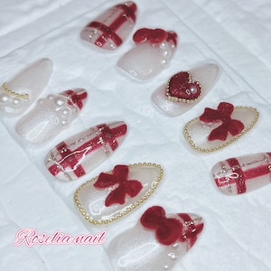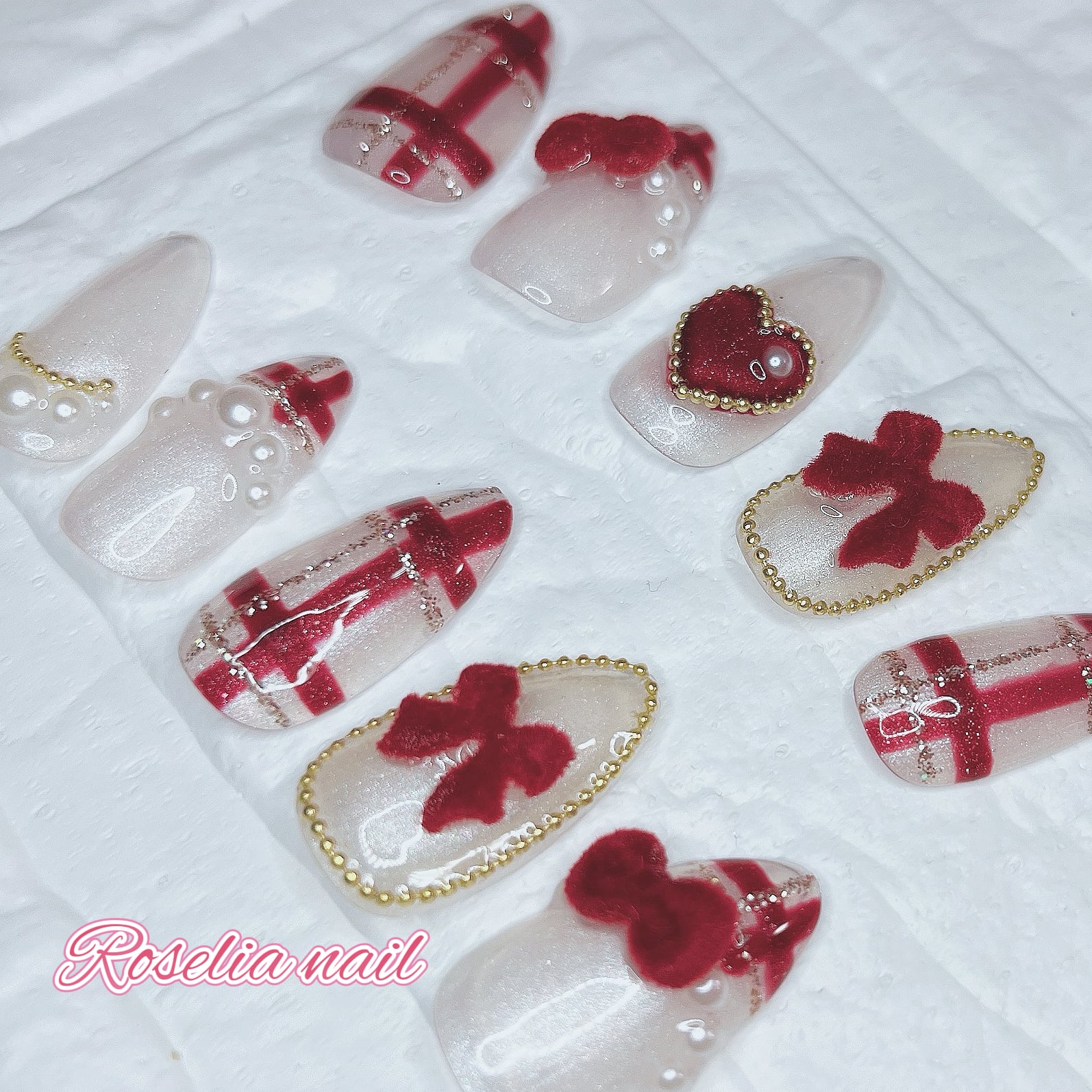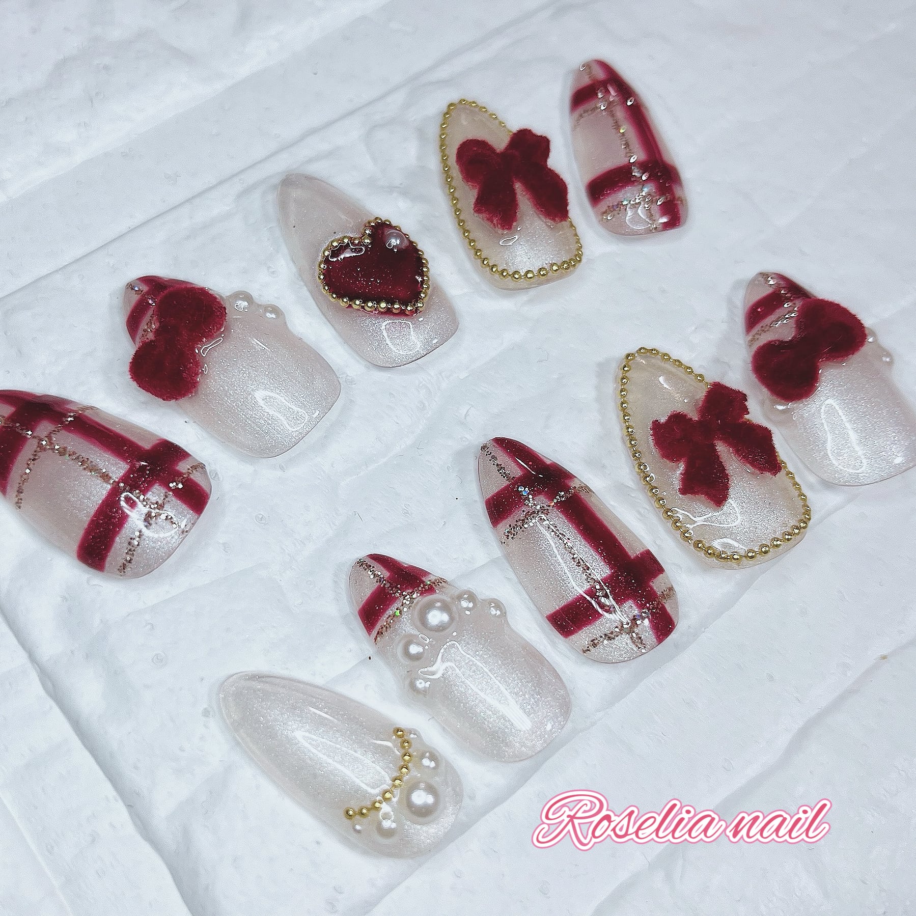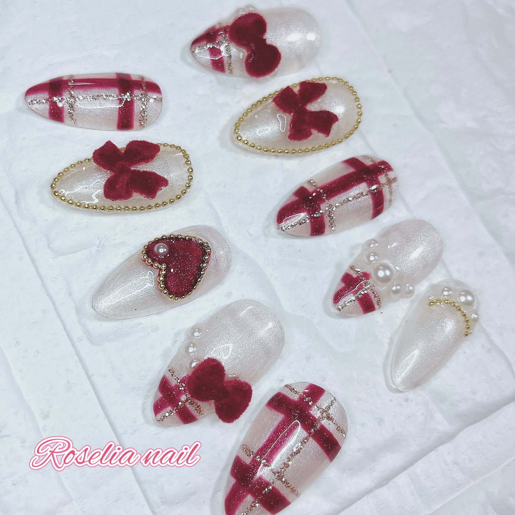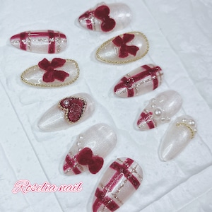 もふもふ・冬・赤・チェック柄・マグネット・リボン・ガーリー・可愛い系・デート・ネイルチップ#ncs026