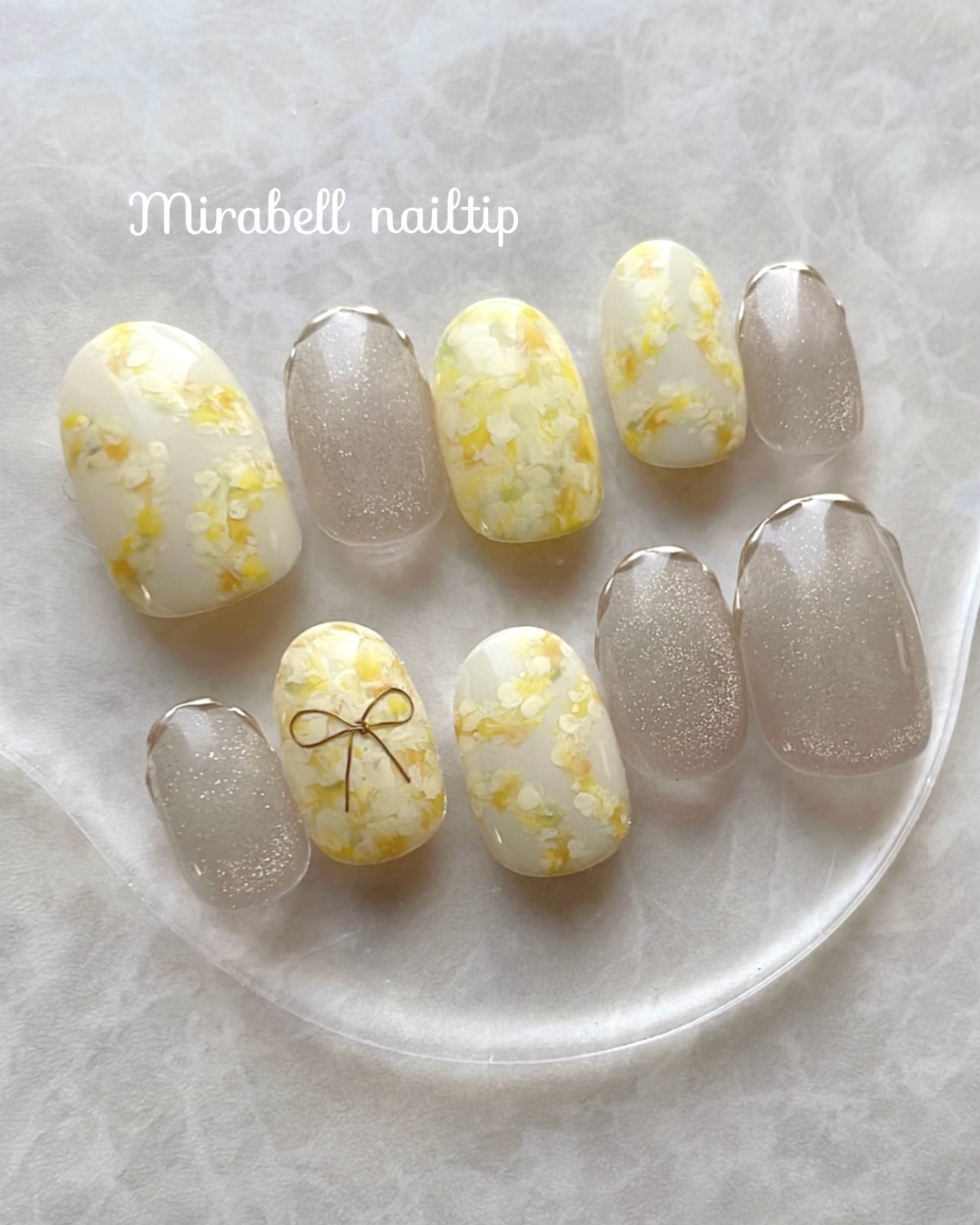 ニュアンス 淡色 ミモザ イエロー 黄色 フラワー リース モコモコ ミラー フレンチ マグネット リボン 手描き 10枚 15枚 ネイルチップ オーダー セット #ncs019
