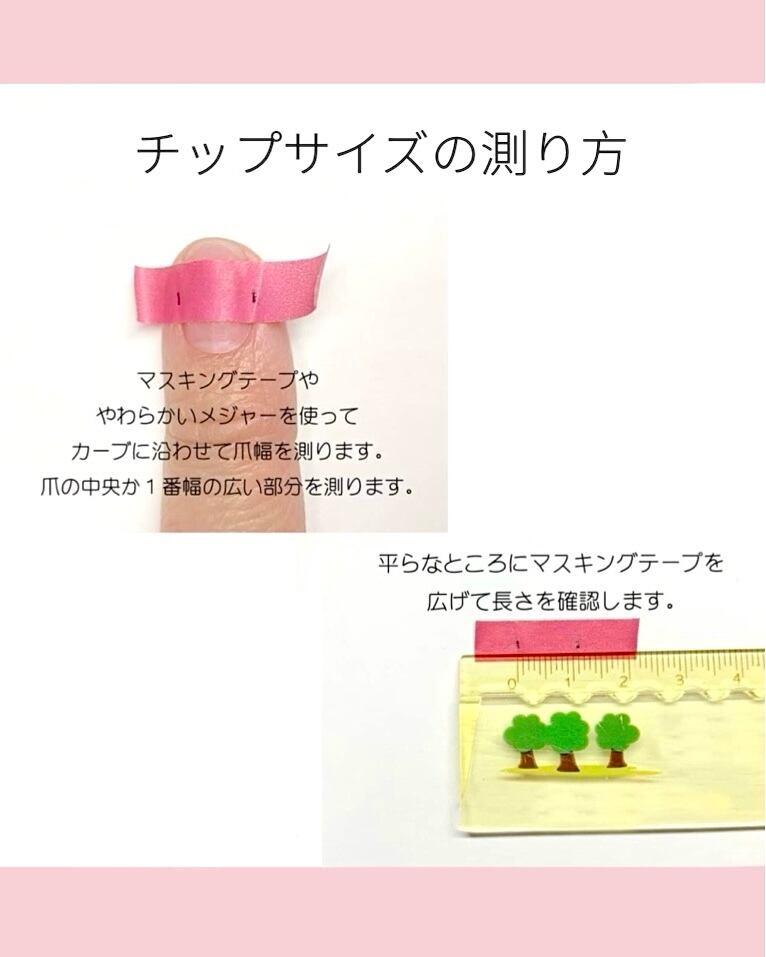 チップサイズによってバランスも多少変わりますのでその時に1番可愛くなる様に努めています!ニュアンスなどは特に毎回全く同じにする事は難しいのですが毎回その時の1番可愛いを求めて制作いたします。