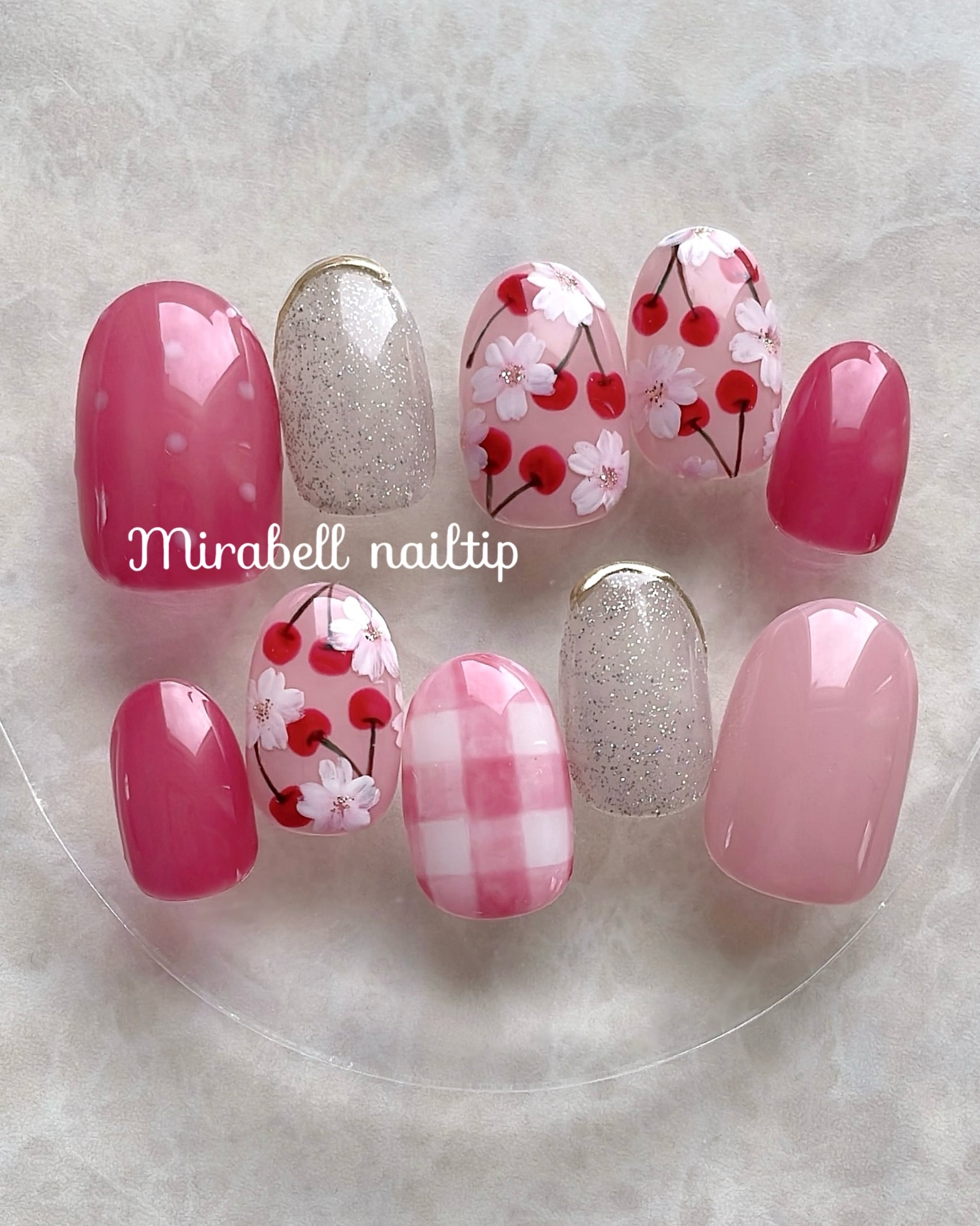 桜 さくらんぼ フルーツ ピンク 赤 マグネット ドット ギンガムチェック チェック 10枚 15枚 ネイルチップ オーダー セット #ncs019