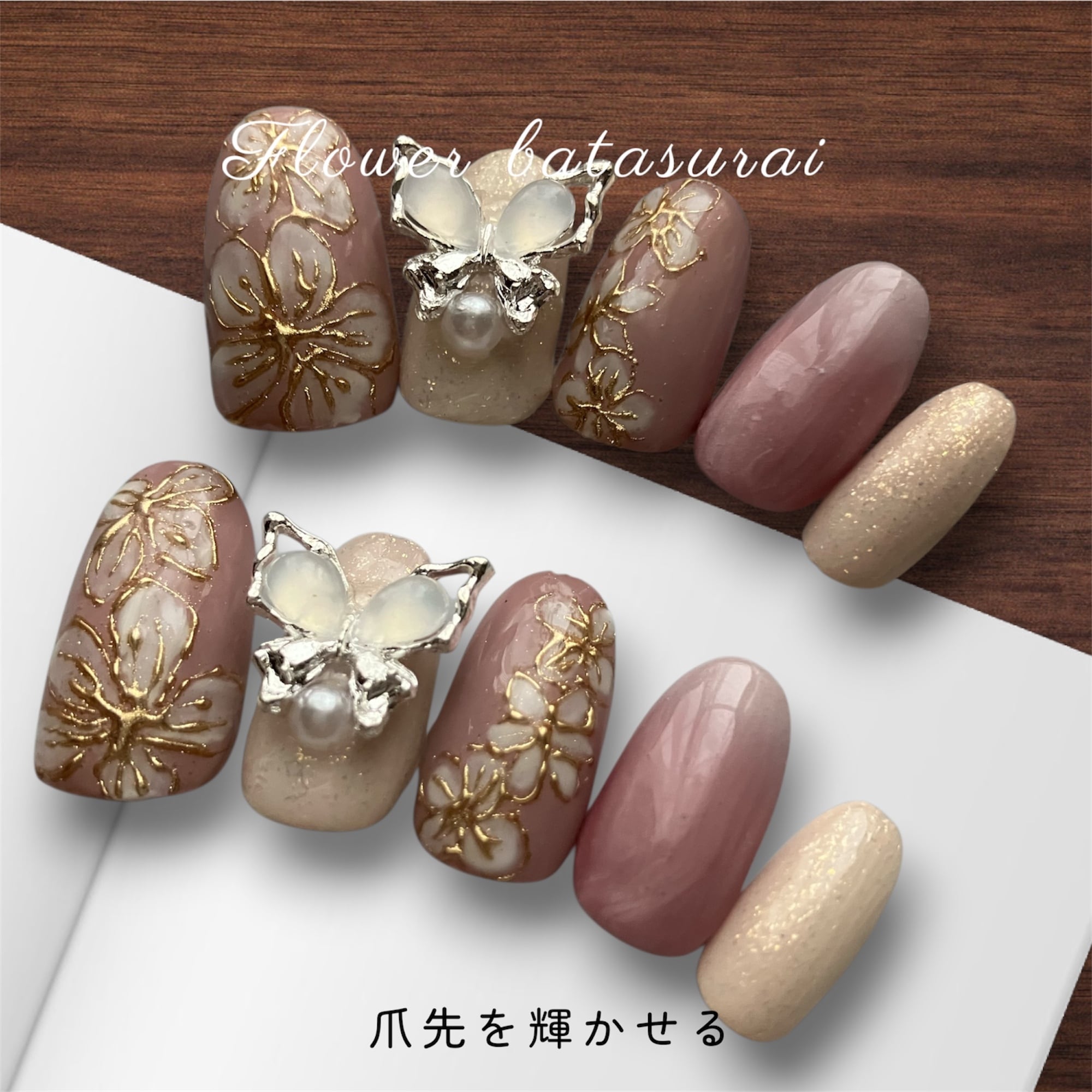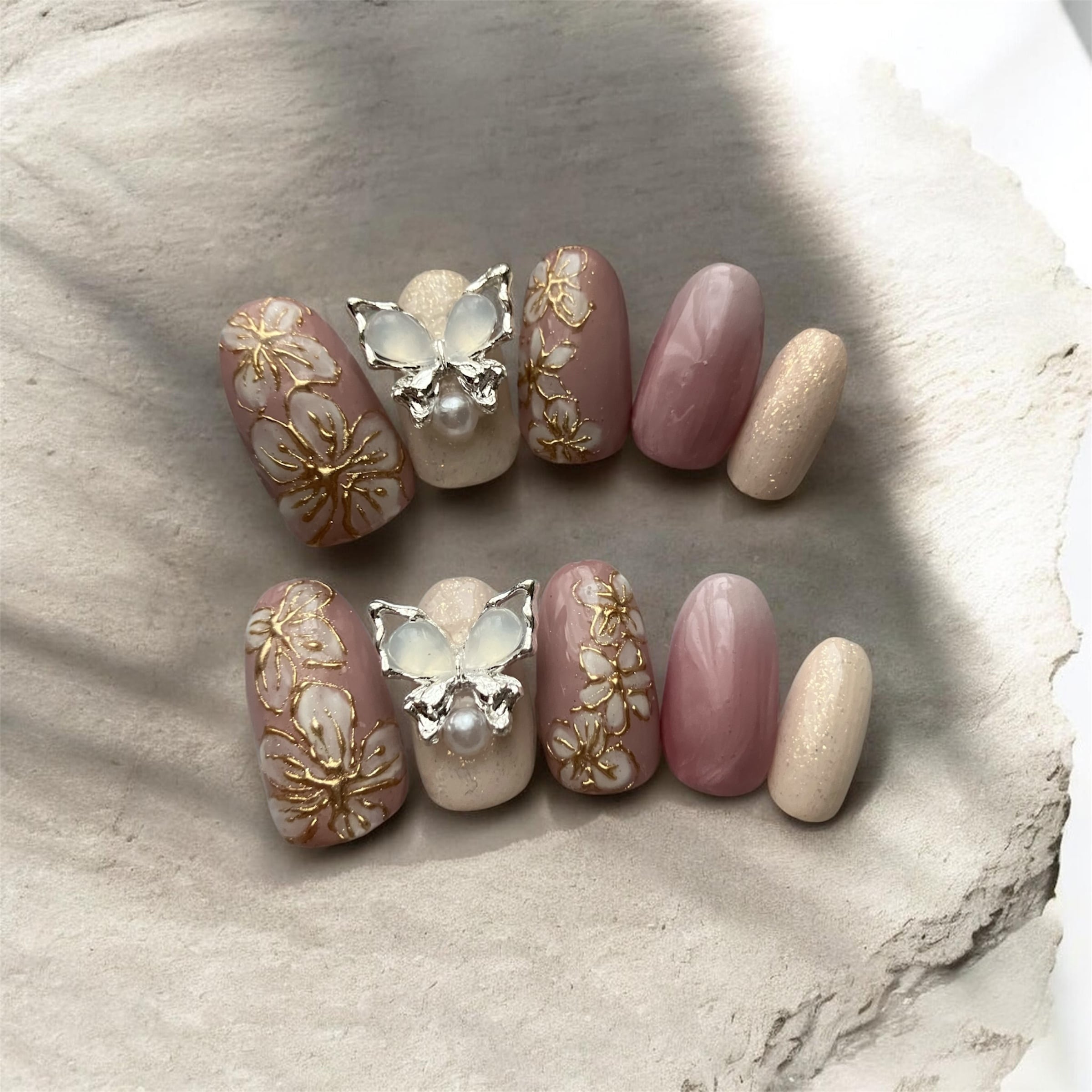 フラワーバタフライネイルチップ / 上品ニュアンス×3Dパーツ #ncs028_003